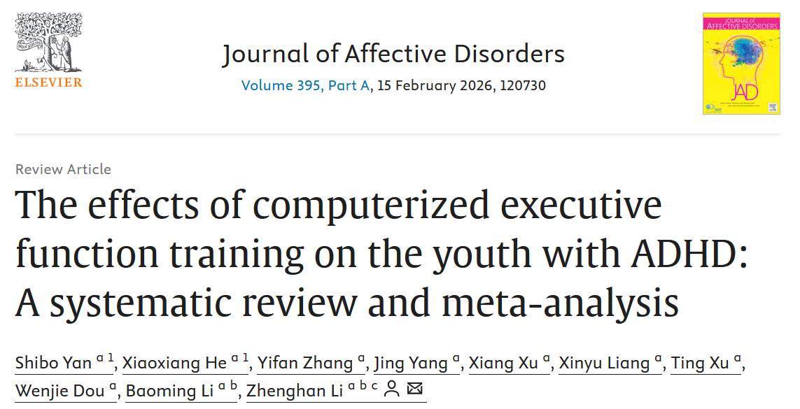 近期,杭州师范大学脑科学研究所李政汉课题组在Journal of Affective Disorders发表题为“The effects of computerized executive function training on the youth with ADHD: A systematic review and meta-analysis”的论文。研究发现,计算机化的执行功能训练显著改善ADHD儿童/青少年的症状、提升ADHD儿童/青少年的认知能力和学业表现,且有较好的长时效果。