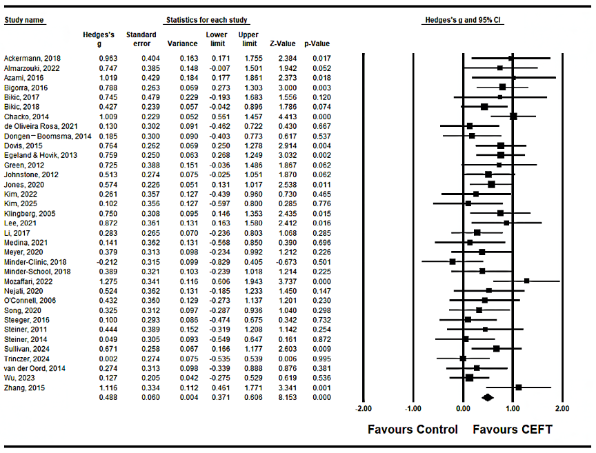 核心发现:CEFT对ADHD儿童具有显著的即时改善效果(图1),同时在近迁移和远迁移方面均产生积极作用,且这些效果表现出良好的持续性。通过元回归分析,未发现显著的调节变量。这一发现为CEFT在ADHD干预中的应用提供了较为充分的证据支持,表明这种训练方式不仅能改善核心认知功能,还能产生更广泛的功能增益。未来研究可进一步探索影响训练效果的具体因素,以促进干预方案的个性化应用。